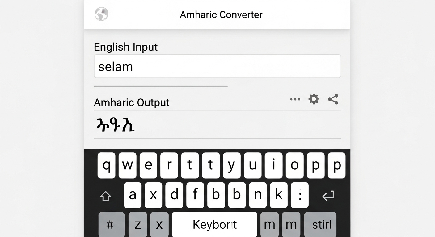 An English to Amharic typing keyboard lets users type Amharic words using English letters. It quickly converts typed sounds into Amharic script. This is called phonetic typing or transliteration. For example, when you type “selam” in English letters, the keyboard shows “ሰላም”. People often search for terms like english typing amharic or type amharic from english. These describe the same process of converting English letters into Amharic script.